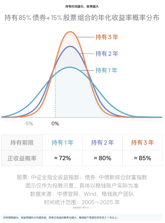 我们按照持有债券 85% + 股票 15% 组合的年化收益率概率进行回测,可以看到,持有一年时,稳钱账户实现正收益的概率约为 72%。因此,建议投资者持有至少 1 年以上。持有时间越长,获得正收益的概率越大,亏损概率越小。