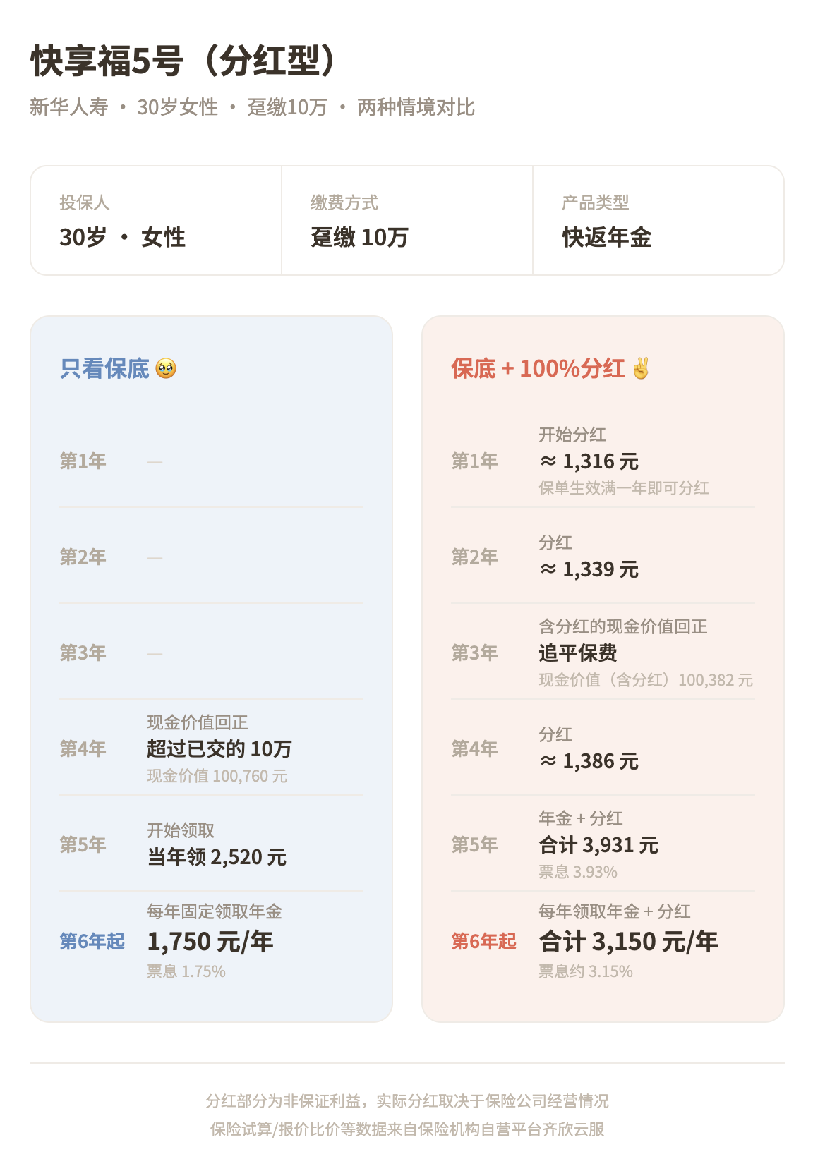 以新华人寿「快享福5号」(分红型)为例,假设一位 30 岁女性一次性买 10 万元,我们来看一下: