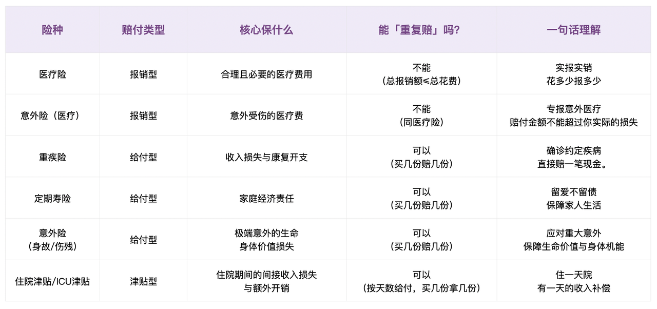 因此,不必再纠结于「能否重复赔」。更好思路是:用报销型保险(医疗险、意外医疗)去覆盖医院里的账单,用给付型保险(重疾险、寿险、意外身故/伤残)去构筑医院外的家庭财务安全网。