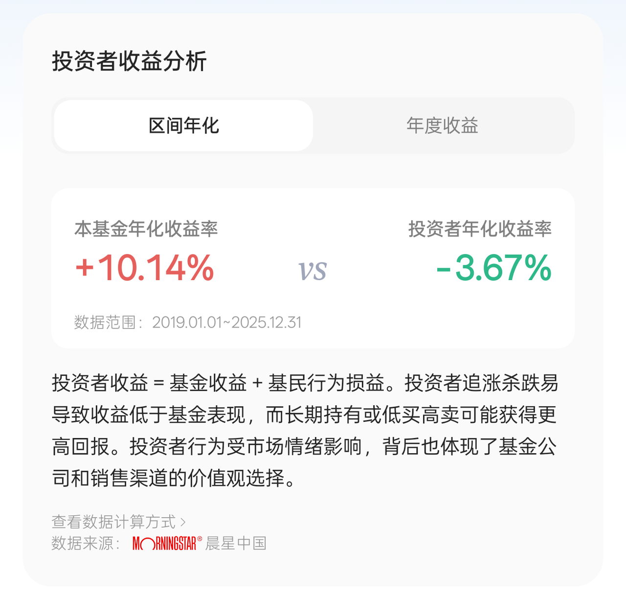 上图中该基金从 2019 年年初到现在,基金年化收益率高达 10.14%。年化 10% 的收益率水平还是相当不错的,但在该区间所有投资者获得的平均年化收益率是 -3.67%。从所有投资者的视角来看,不仅没赚钱,还是亏钱的。这说明大量投资者在该基金上进行了追涨杀跌的投资操作,高位接盘、低位卖出,拖累了投资者的整体回报。