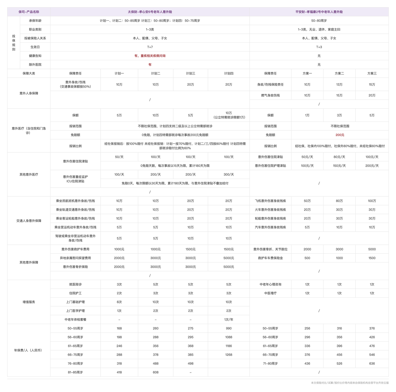 如果追求性价比,选「计划一」就够了。意外保障全面,意外医疗有 5 万元,价格也便宜,已经足以应对长辈的高频意外风险。如果看重就医体验,选「计划四」,除了意外医疗保额提升到 10 万,它还支持到公立医院特需部就诊,能给父母提供更好的医疗环境。