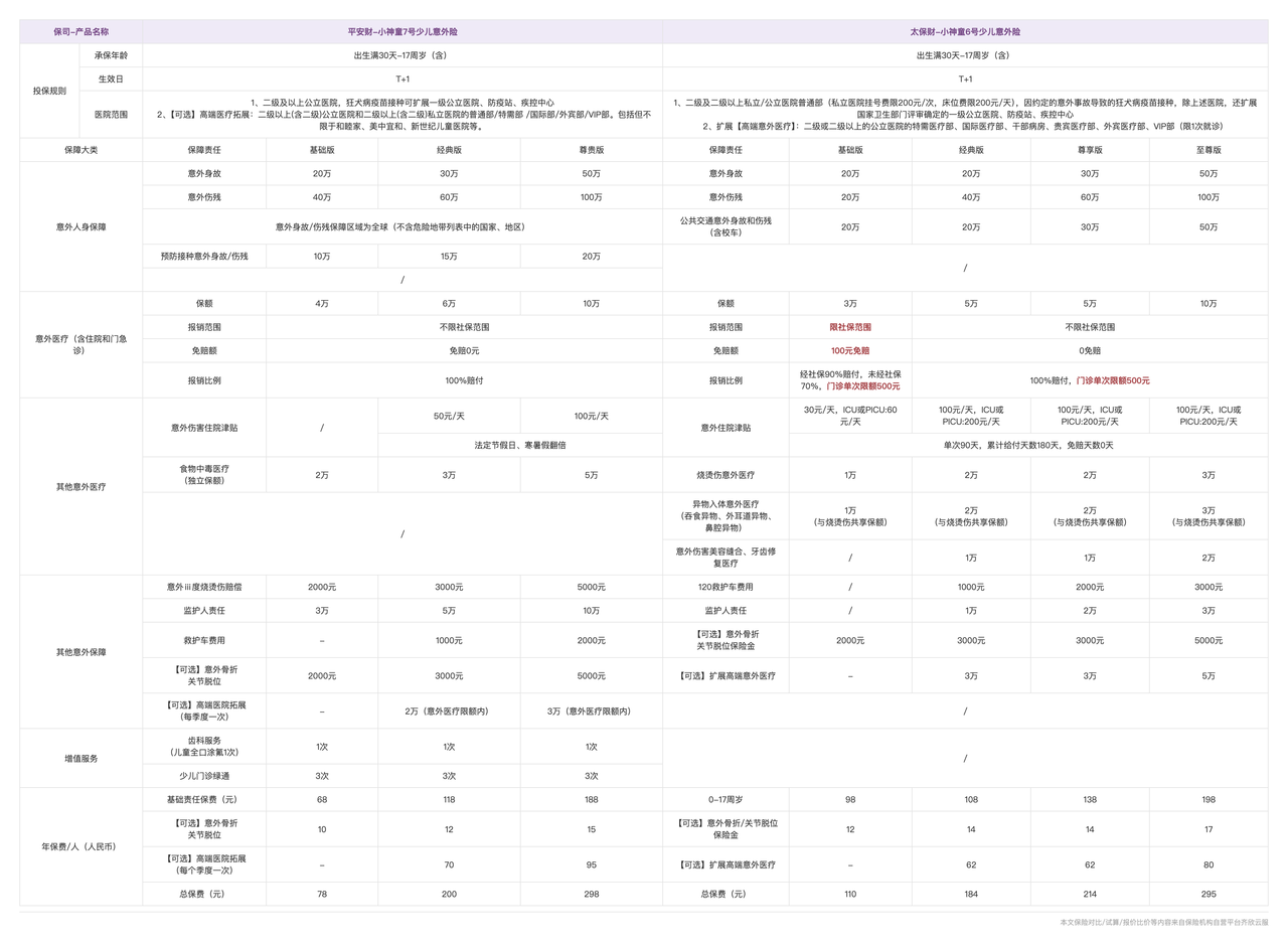 基于这些要点,首推 小神童7号。基础版身故保额 20 万、伤残保额 40 万,意外医疗 4 万,0 免赔、不限社保范围,日常小意外用起来很顺手。基础保障里还带了食物中毒医疗、Ⅲ 度烧烫伤、打疫苗意外,以及监护人责任等——可以说是把家长们最担心的几种情况都考虑进去了。增值服务也不错:一次全口涂氟 + 三次门诊绿通,可以指定三甲医院科室。