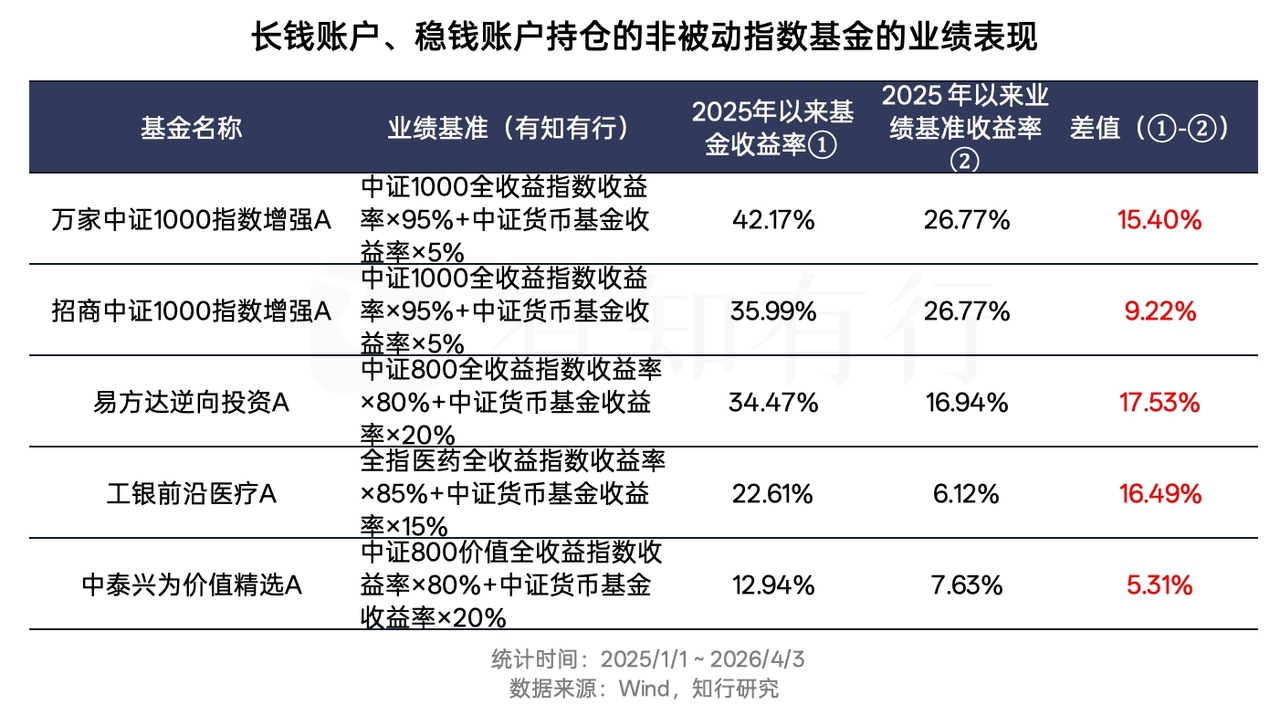 2025 年基金年报披露完毕,我们本周结合年报数据,看看长钱账户、稳钱账户持仓的指数增强基金及主动管理基金 2025 年以来的表现。