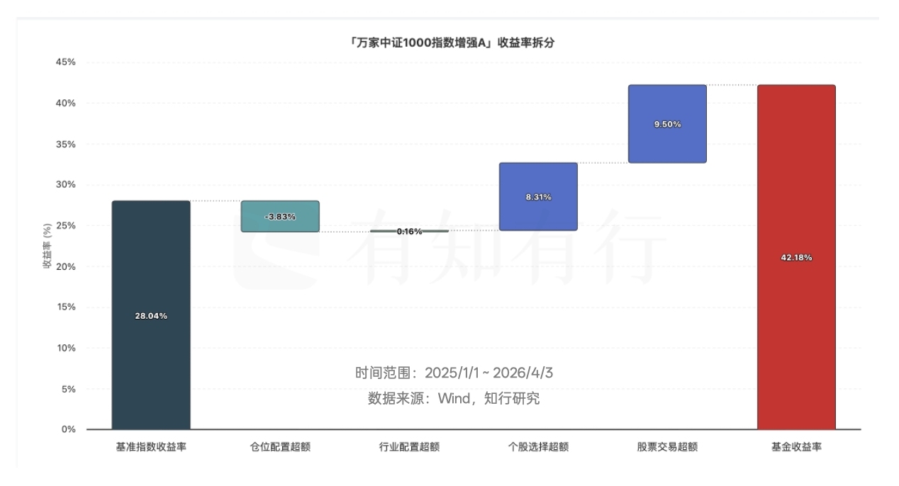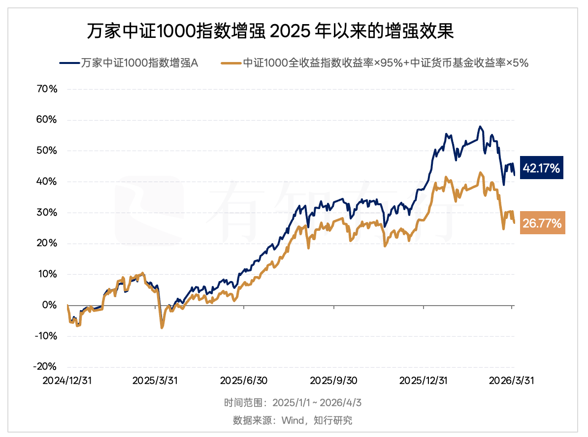 从 2025 年年初到 2026 年 4 月 3 日,万家中证1000指数增强A的收益率为 42.17%,而它的业绩基准(中证1000全收益指数收益率×95%+中证货币基金收益率×5%)收益率为 26.77%。这意味着,这只基金跑赢了基准 15.40 个百分点。这就是「增强」的效果。