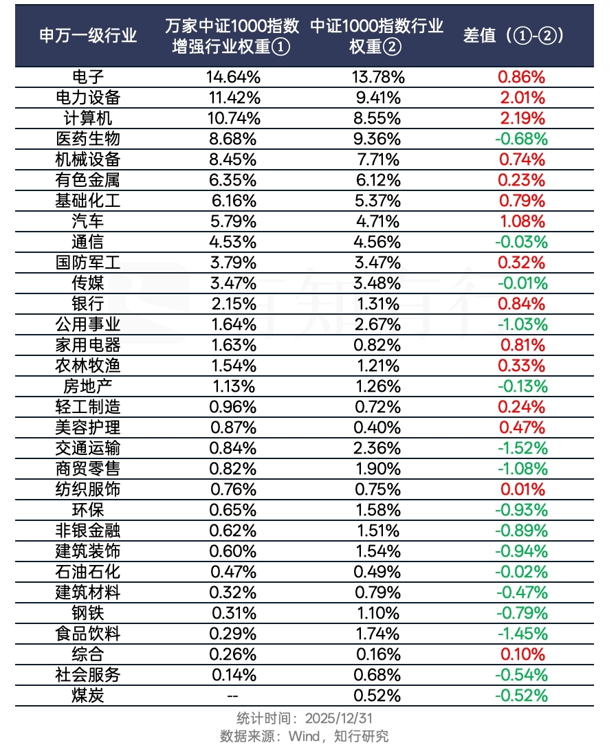 我们来看看该基金的基金经理的选择。下图展示了 2025 年年末,该基金持有的全部股票对应的行业配置,以及中证1000指数里所有股票对应的行业配置,来看看二者的差异。