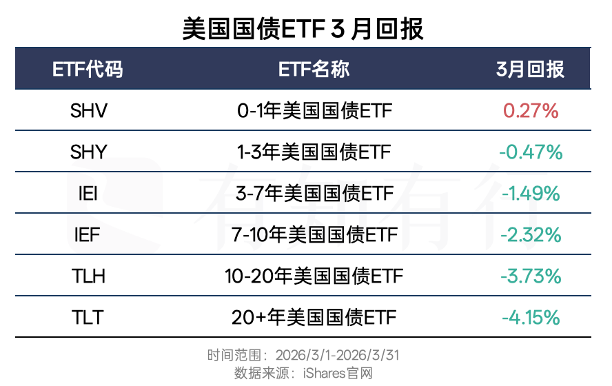 接下来我们看看债券市场方面。2026 年 3 月美债大部分是下跌的。下图展示了不同期限美债 ETF 的业绩表现。短久期的0-1年美国国债ETF上涨 0.27%,长久期的20年+美国国债ETF下跌 4.15%,久期越长,跌幅越大。