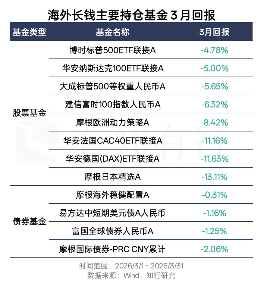 下面展示了海外长钱主要持仓基金的 3 月回报。我们可以看到,基金层面的收益都是负的,原因就是前面我们说过的。