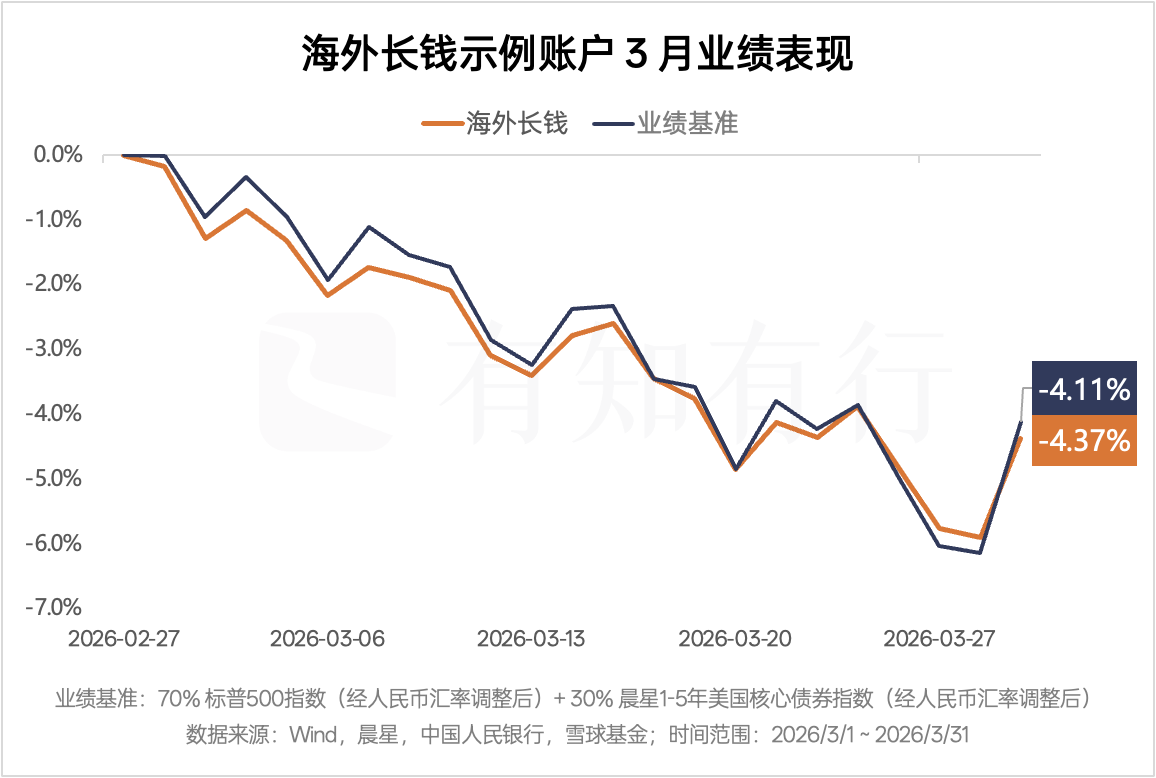 综合各种影响后,我们看到 3 月海外长钱示例账户扣费后业绩为 -4.37%,业绩基准为 -4.11%,两者表现差异不大。因为海外长钱大部分配置的还是美股,欧洲和日本合计占比 10%,占比并不高,所以两者的下跌对组合的拖累也不是很明显。