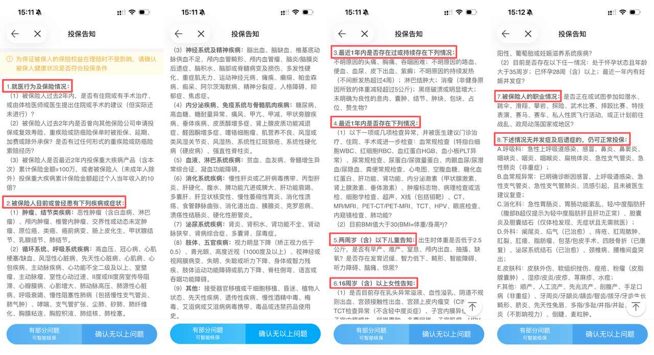 症状和检查类的问询,只回溯近6个月,且没有「不明性质的肿瘤/肿块/结节/占位性病变/息肉/赘生物」这条覆盖面极广的表述——这是很多人在达尔文12号里最容易被拦住的一关。对女性来说,卵巢囊肿、多囊卵巢、子宫肌瘤都没有直接问询。双向情感障碍、血管钙化/硬化/狭窄/斑块、白内障等常见情况,同样不问。