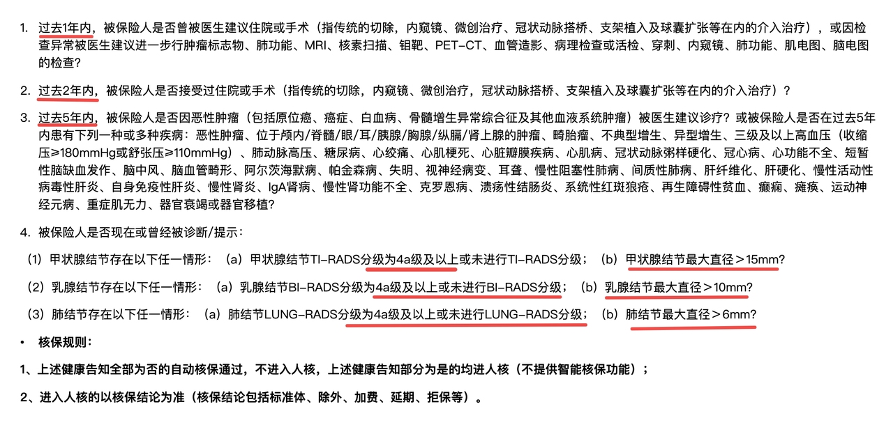 以常见的甲状腺结节为例,清单中有明确问询,如果过往体检涉及相关情况,就需要告知,然后进入智能核保环节。一般来说,未手术的 TI-RADS 1–2 级、且结节最大直径 ≤15mm,才能标准体承保。超出这个范围,核保结论通常是「除外甲状腺及相关疾病承保」(也就是甲状腺相关的理赔不赔,其他重疾正常赔付)和拒保。
