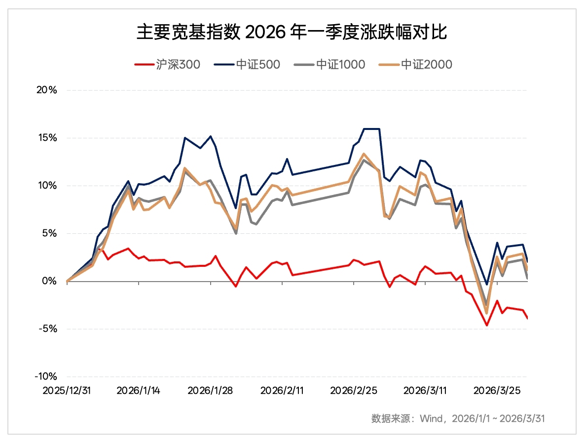 首先来看看A股的表现。下面这张图展示了主要宽基指数 2026 年一季度的涨跌幅变化。作为不同类型的规模指数,中证500、中证1000、中证2000在 1 月份上涨明显,尤其是中证500,1 月份上涨 12%,期间最高涨幅达到 15%。2月份市场整体横盘震荡,情绪逐渐冷却。2 月底 3 月初,中东冲突加剧,全球股市受此影响,整体下跌,A股也不能幸免,尤其是之前火热的中小盘股、成长风格的股票,跌幅更大。