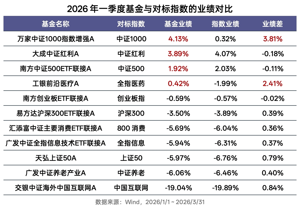 接下来,我们看看黑板报持仓基金和对标指数在 2026 年一季度业绩对比,展示在下图中。