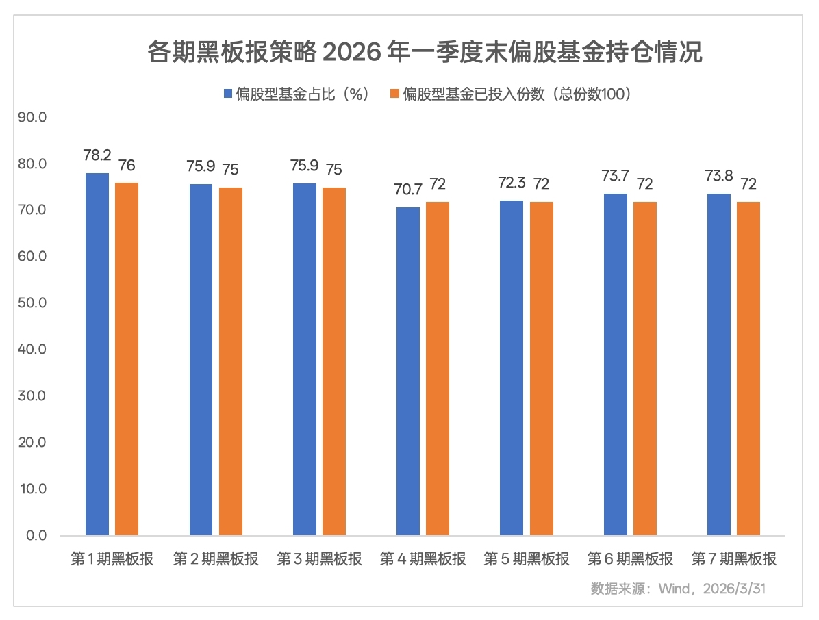 接下来我们看看 2026 年一季度各期黑板报策略的业绩表现情况。尽管第 1-7 期黑板报的股票仓位和具体持仓有所不同,但由于持仓风格一直保持统一,以大盘为主、中小盘为辅;价值、成长、均衡风格分散配置。因此,第 1-7 期黑板报同样区间内的业绩走势是较为类似的。
