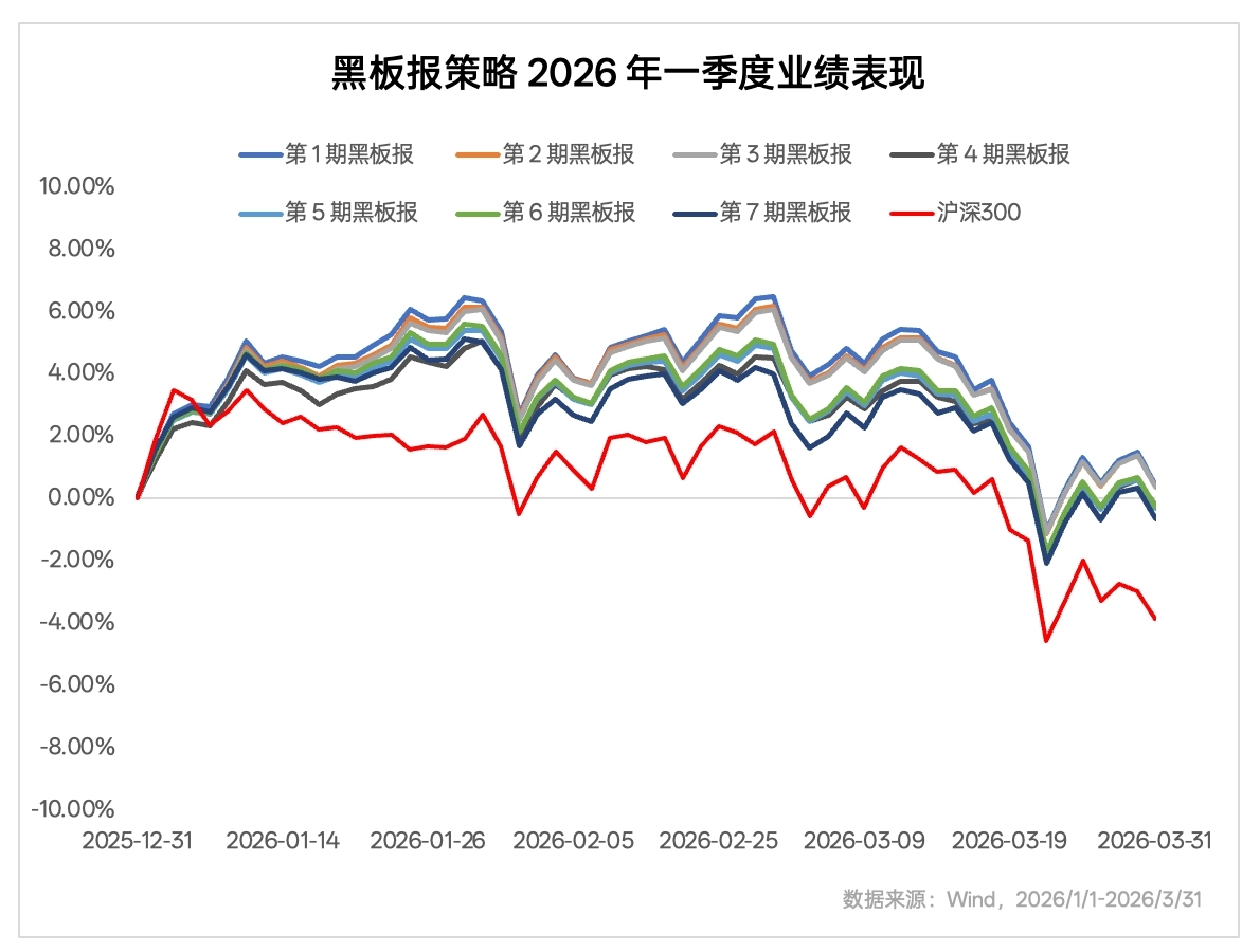 各位关注黑板报策略的老朋友们,大家好。2026 年一季度已经结束,又到了回顾各期黑板报策略整体表现的时候了。