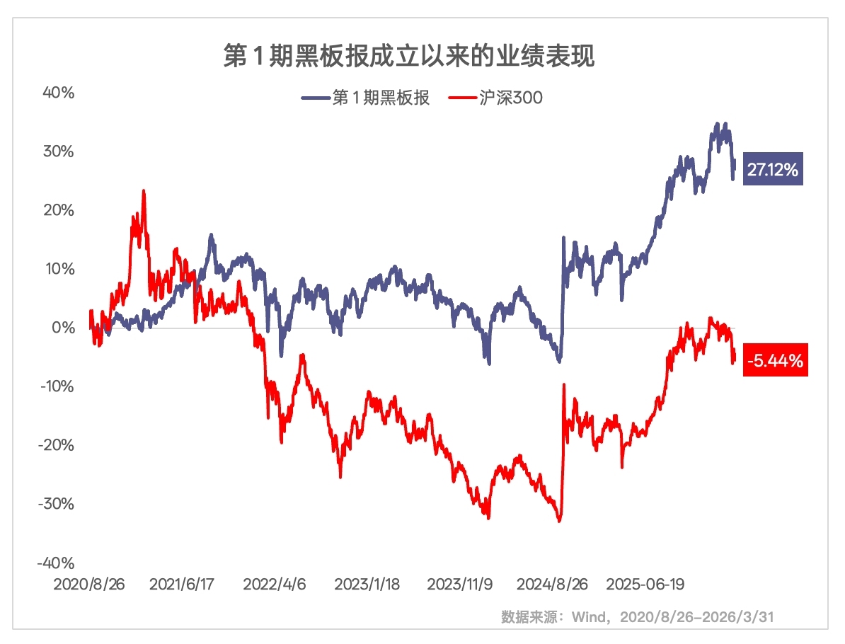 拉长时间来看,各期黑板报策略相对于沪深300,都有一定程度的超额收益。下面这张图是第 1 期黑板报成立以来的业绩表现。第 1 期黑板报成立于 2020 年 8 月 26 日,截止到 2026 年一季度末,区间收益率是 27.12%。相对于沪深300指数,创造了 32.56% 的超额收益。