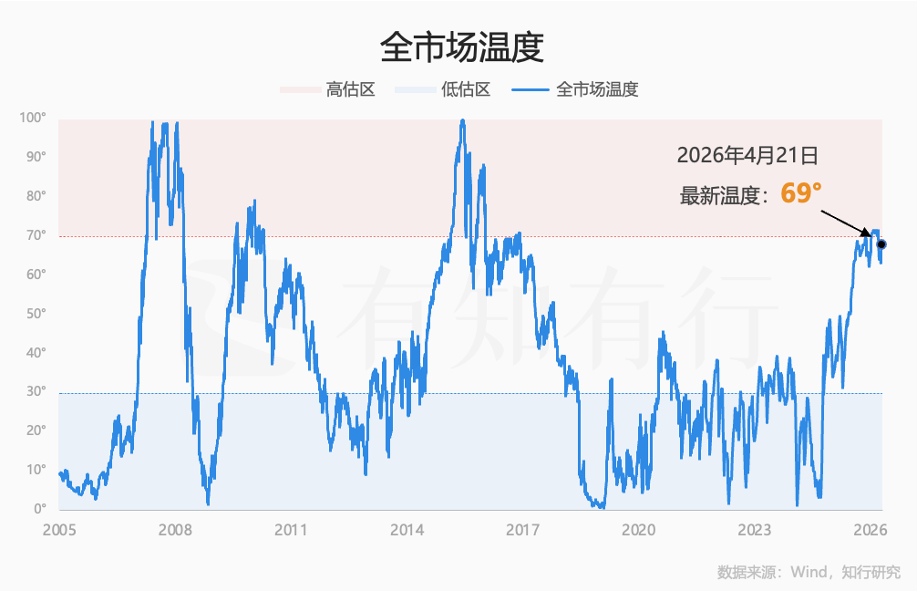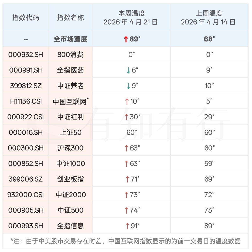 先来看最近一周的股市表现。从上周三到本周二,A股表现不错,大部分行业和股票都出现了上涨,最新的全市场温度提高到 69°,再次来到了 70° 附近。