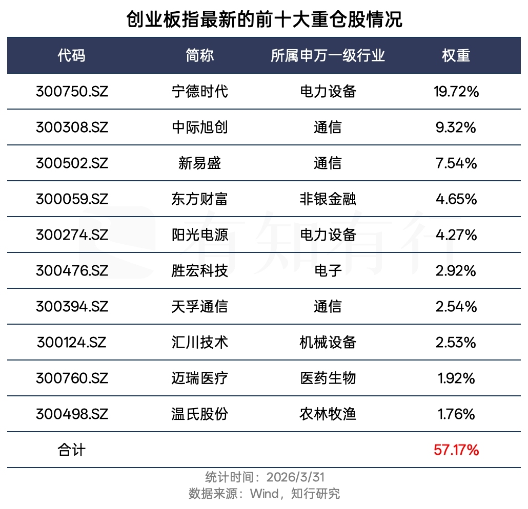 我们从图中能看到,创业板指前十大重仓股合计占比将近六成,宁德时代占比接近 20%,中际旭创和新易盛的占比也不低。重仓股的业绩报喜,为指数上涨提供了坚实的基本面支撑。