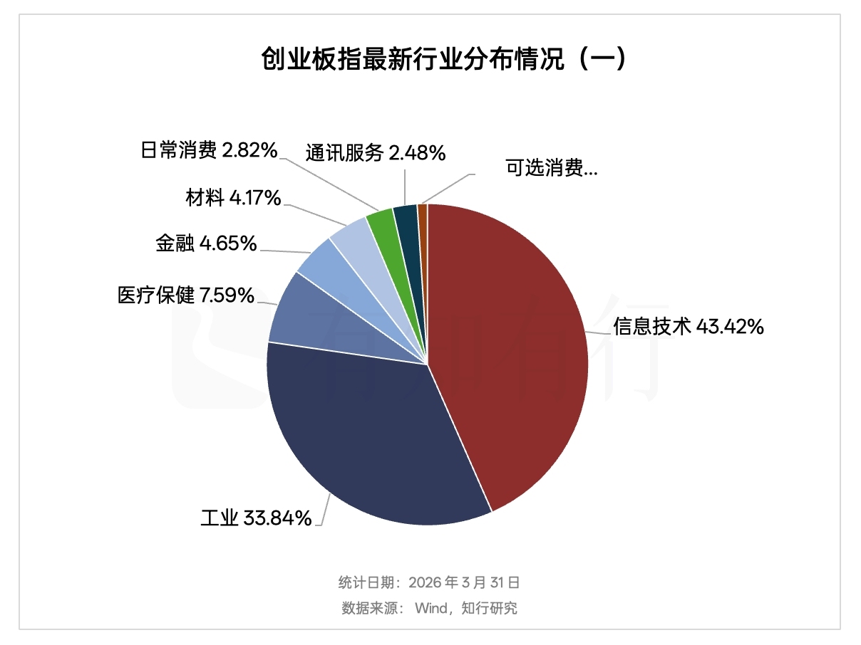 从大类行业来看,创业板指里,信息技术占比 43.42%,工业占比 33.84%,医疗保健占比 7.59%,金融占比 4.65%。信息技术加工业合计占比超过 77%,这说明创业板指是一个典型的以科技制造业为主的指数。