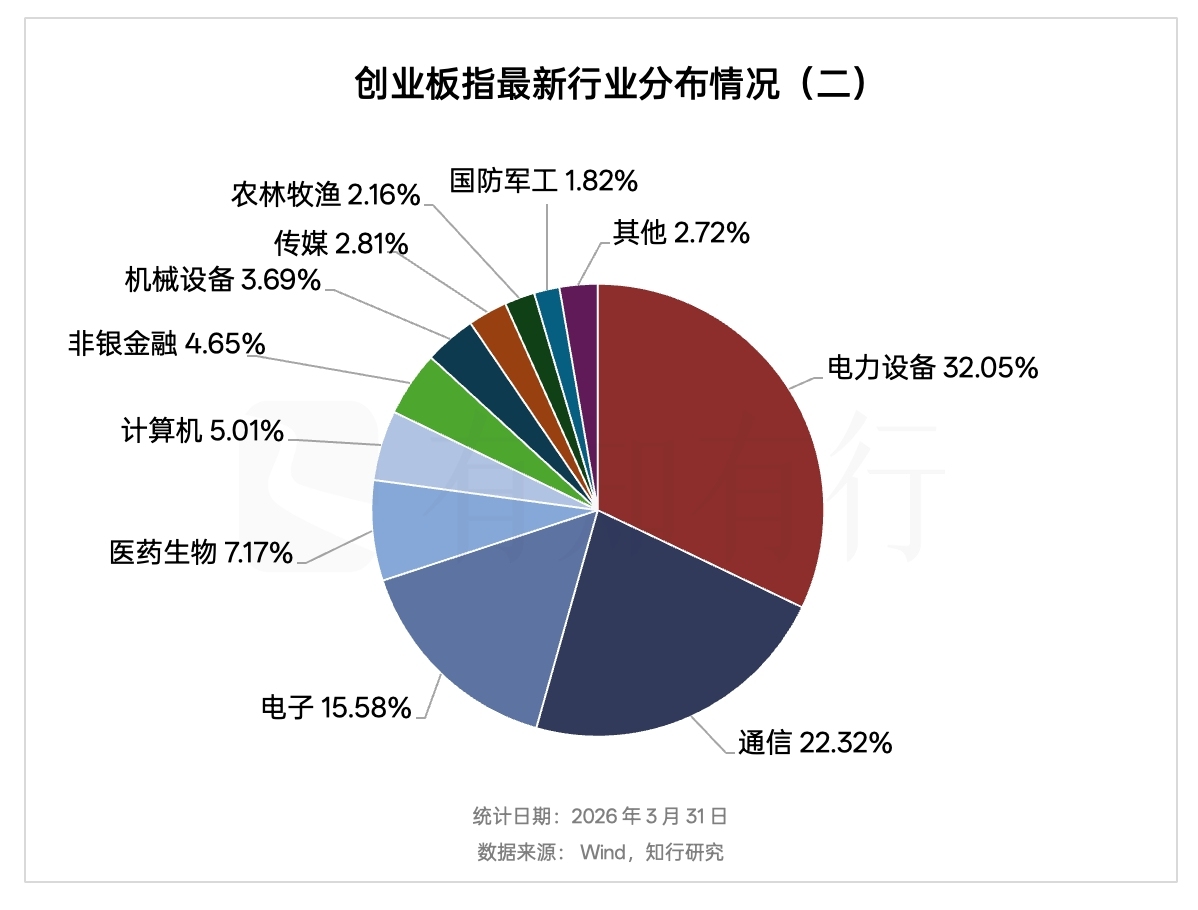 其实不止是近期如此,从 2024 年 9 月底以来,创业板指整体出现了快速上涨。创业板指重仓的行业里包含了市场热门主题,在这两年时间内颇受关注。下面两张图展示了不同行业维度下,创业板指最新的行业分布情况。