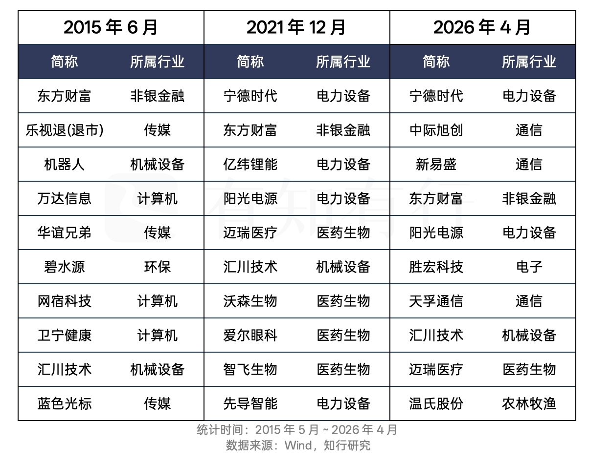 从这张图的变迁,我们可以清楚地看到中国产业升级的路径:从互联网商业模式创新,到新能源和医药的制造升级,再到现在的能源革命和人工智能。值得注意的是,东方财富和汇川技术从 2015 年至今仍然位居前十,这说明创业板指并非简单地喜新厌旧,而是能识别并留住那些能持续进化、跨越周期的真正赢家。