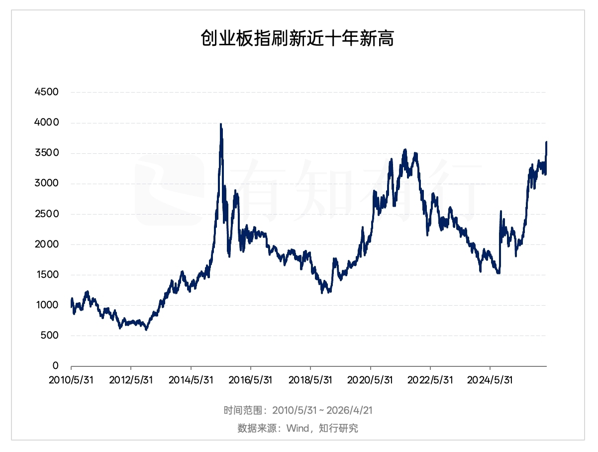 近期市场关注度很高的事情是创业板指的快速上涨,从 4 月 7 日收盘到 4 月 21 日收盘来看,创业板指短短时间上涨了将近 17%,已经刷新了最近十年的新高。下图展示了创业板指从 2010 年发布以来的行情走势。