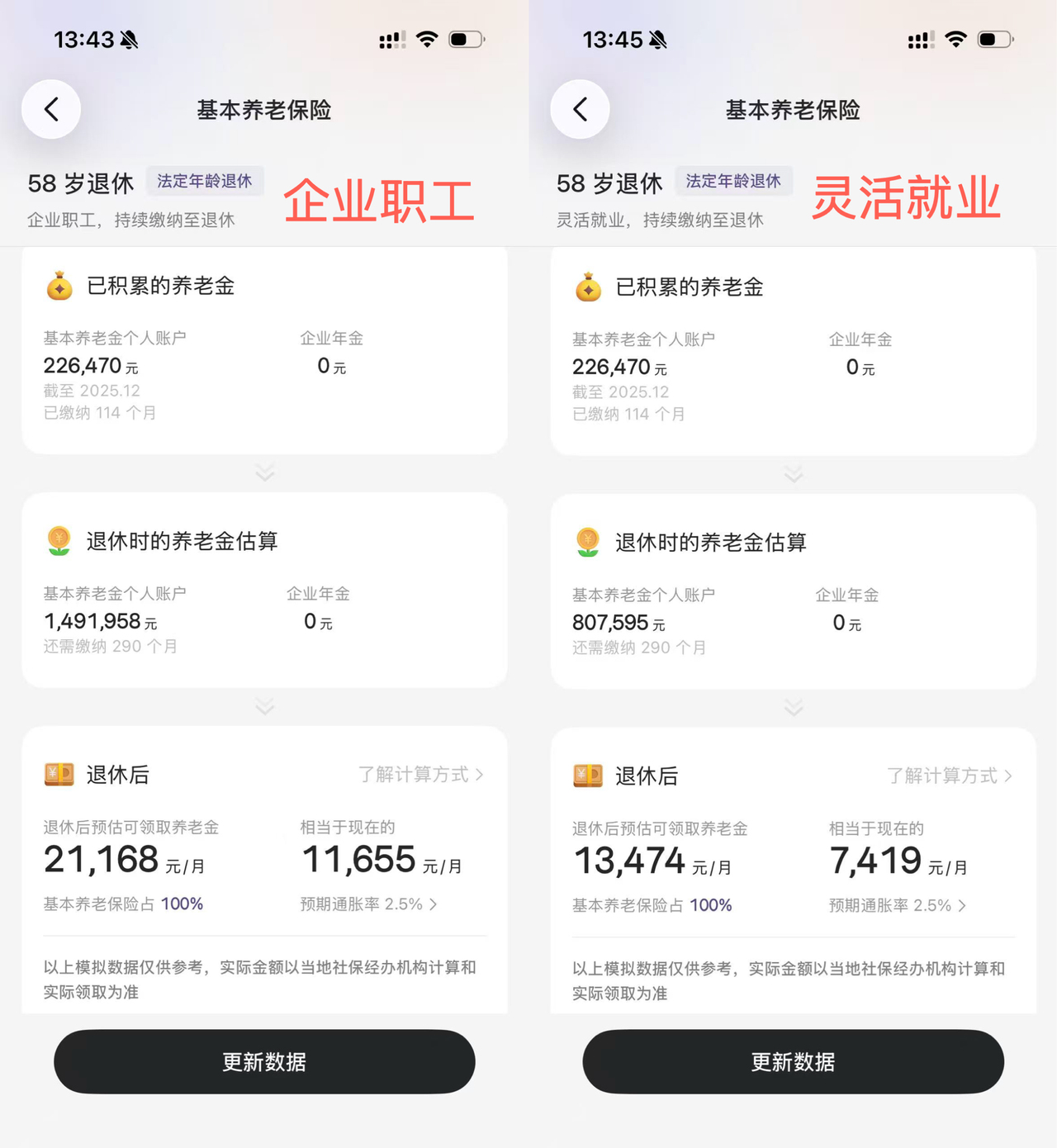 这和在单位时缴的是同一套体系,养老金计算规则、医保报销待遇等核心权益完全一致。主要的区别在于:单位原本帮你出的那部分,现在要自己承担了,整体缴费压力会更大。