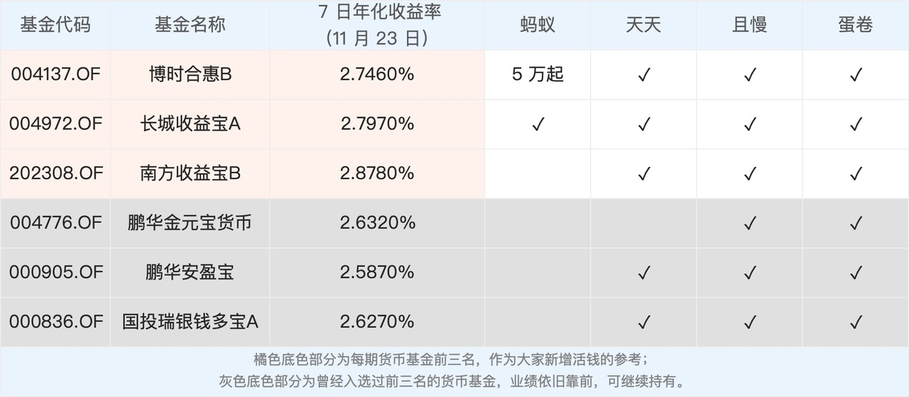 照惯例为大家奉上近段时间货币基金表现筛选结果,排名前三的依旧是博时合惠B、长城收益宝A、南方收益宝B(排名不分先后)。