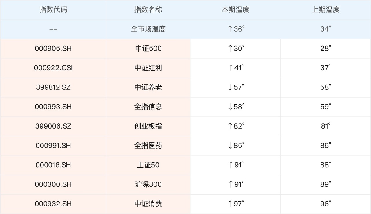 本周最新股市温度为 36°,跟上期相比,小幅提升。具体指数温度方面,之前没怎么涨的中证 500 和中证红利近期有所发力,尤其是中证红利,最近一个月上涨了 10%,所以温度上来得很快。我们在低位买的中证红利指数基金也开始赚钱了,开心。
