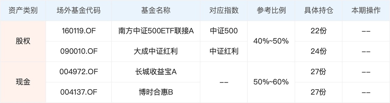 为了更好地体现这一点,我们把持仓的比例换成了份数。如果大家当下有一笔钱买入,例如 20 万,大家可以分成 100 份,记住自己每份的金额,当我们本期有操作时,大家就可以知道买入什么,买入几份,对应多少资金了。