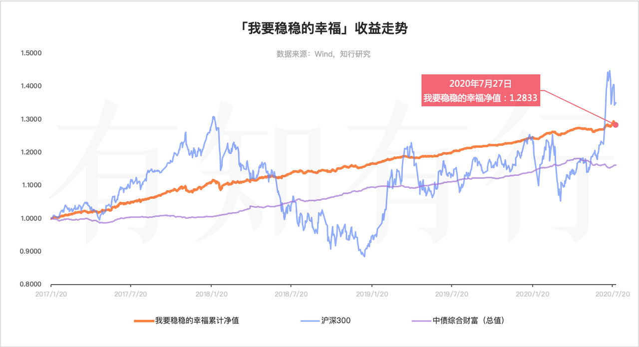 相比成立时间较短的产品,「我要稳稳的幸福」从 2017 年运作到现在,有 3 年半了,经受住了债市、股市的不断冲击,最大回撤只有 2.79%。