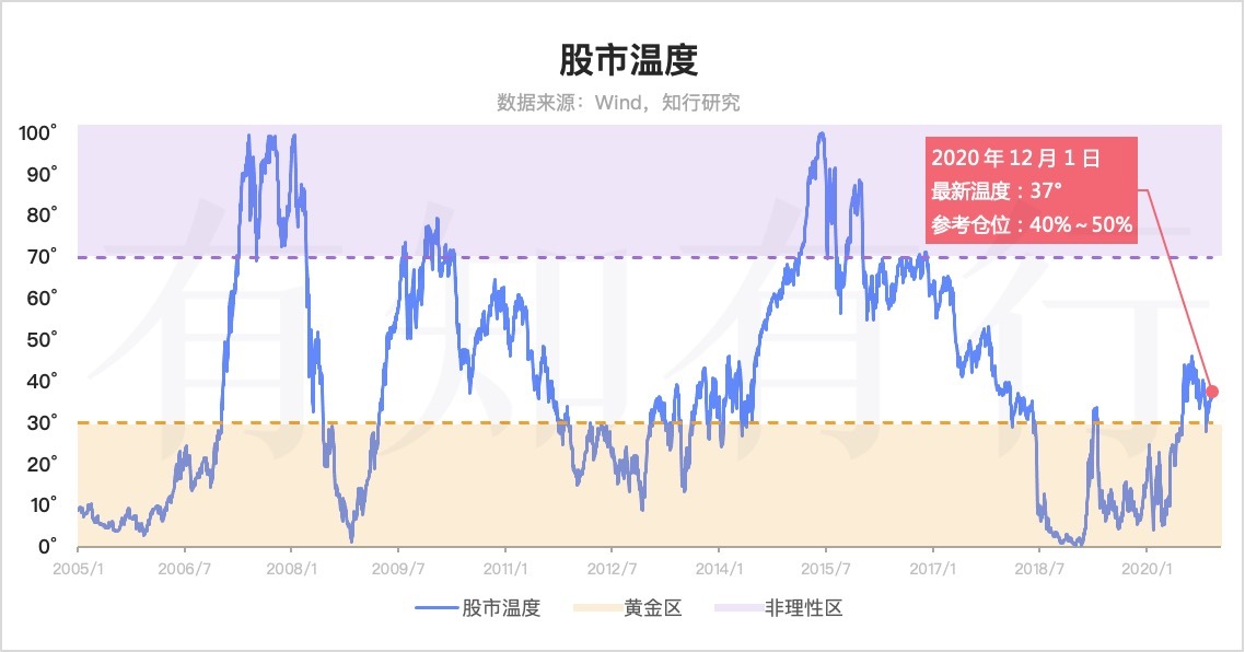 根据最新股市温度,我们的参考仓位为 40%~50%。