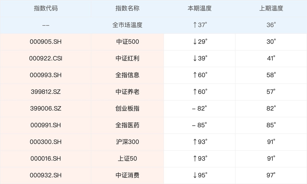 本周最新股市温度为 37°,跟上期相比,小幅提升。具体指数温度方面,有涨有跌。中证500和中证红利本周有所下跌,仍旧垫底。全指信息和中证养老有所上涨,还处于中估区间。我们继续观望。