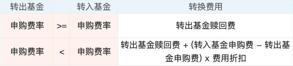 基金转换费用是由「转出基金赎回费用」、「转出转入基金申购补差费用」两个构成。根据转出基金和转入基金的申购费率关系,有下表两种情况: