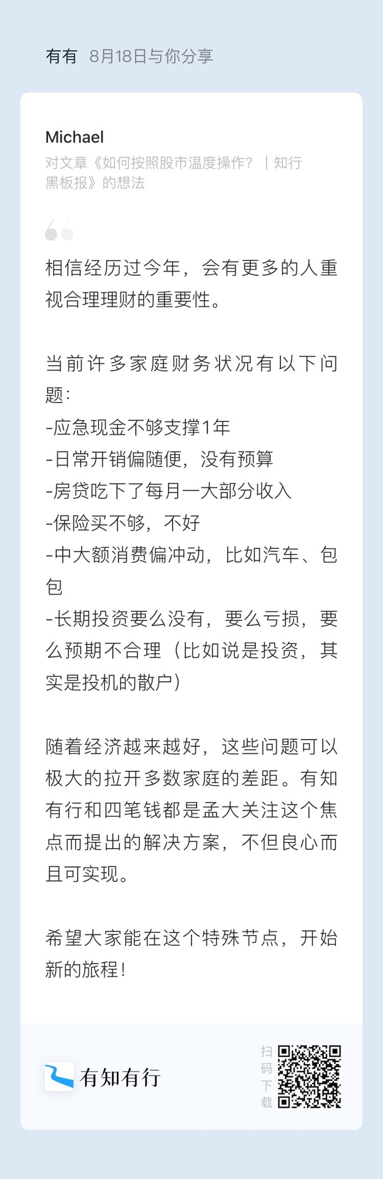 「四笔钱」的思想,相信大家都明白,但是「明白」和「做到」之间,还有一道墙。尤其今年宏观经济环境确实不佳,也出现了很多以前难以预见的事情。多多复盘自己「四笔钱」的整体规划,看看是不是和想象中有差距,或许比在不同产品间比较、纠结更为重要。