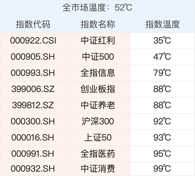 股市上涨,股市温度也随之上升到 52℃。跟上期相比,我们给出的 A 股仓位是 15%~25%,有所降低。具体指数方面,中证红利、中证 500 的温度分别是 35℃ 和 47℃,估值不高,可以平均配置。由于债券还没有发出买入信号,所以我们除股票外的其他仓位仍暂时放在货币基金中。