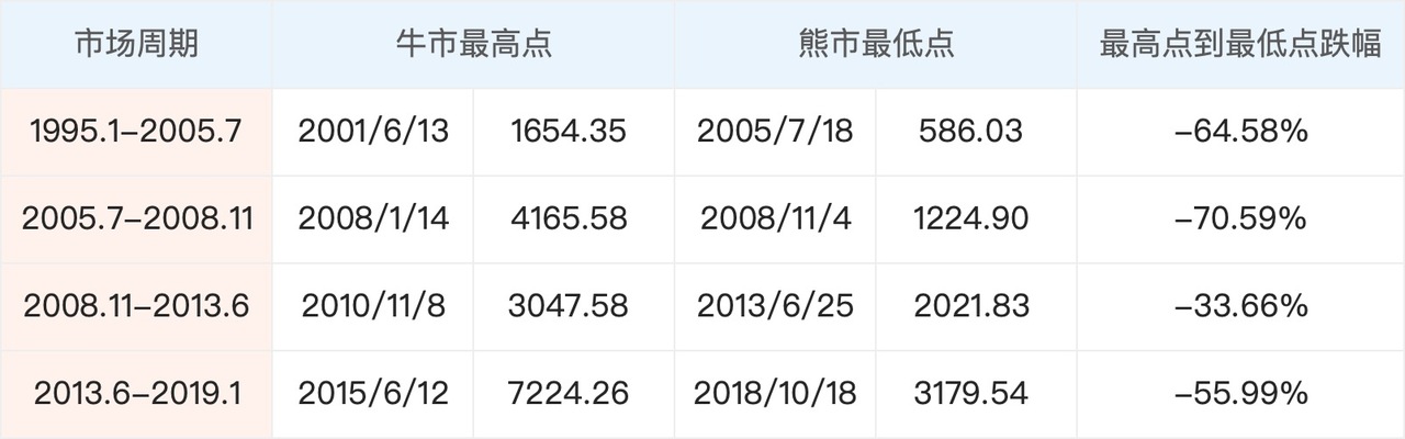 参考海通证券对牛熊周期的划分,1995 年以来 A 股经历了四轮完整的牛熊周期,目前处于第五轮中。我们来看一下前四轮完整周期指数的表现如何。以万得全A指数为例,从牛市最高点到熊市最低点,跌幅最大的是 2005~2008 年那一轮牛熊市。从 2008 年 1 月 14 日收盘价 4165.58 点,到 2008 年 11 月 4 日的 1224.90 点,万得全A跌幅是 70.59%。