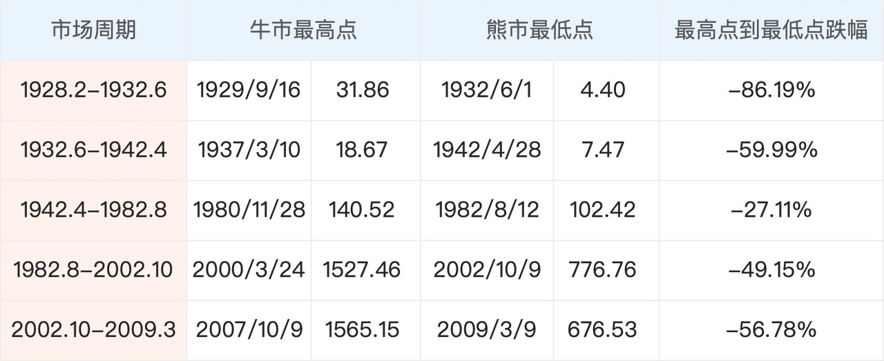 我们以现在最具代表性的标普500指数为例。标普500是从 1928 年开始的,涨涨跌跌到现在,出现了 5 轮可以确认的完整牛熊市。