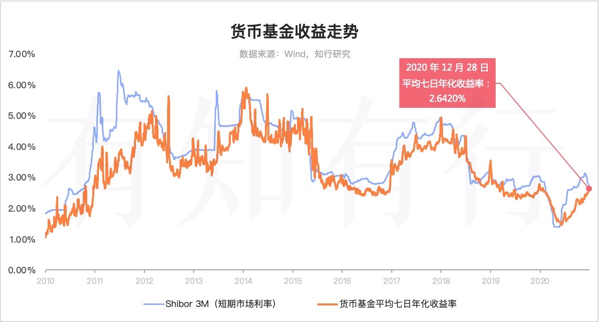 随着疫情得到控制,复工复产稳步推进,到了下半年,宽松的货币政策开始逐渐退出,短期市场利率和活钱管理产品收益率也开始慢慢回升。等到了年末,也就是最近,旺盛的市场跨年资金需求,终于推动活钱管理产品收益率回升到了年初的水平。