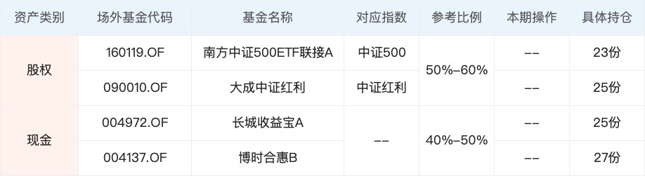 通过临时加仓,我们持有中证500指数基金 23 份,持有中证红利指数基金 25 份,其余配置在货币基金中。如果上周四来不及跟车的,本周最新温度仍然是 28°,中证500和中证红利也没上涨,现在仍然可以上车。