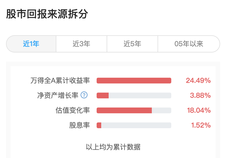 万得全A是一个代表全市场的包含股息收益的指数,过去一年万得全A上涨 24.49%,其中代表企业盈利增长的净资产增长率为 3.88%,股息率为 1.52%,估值变化率为 18.04%。这说明,过去一年股市上涨主要是靠情绪带来的估值变化导致的。