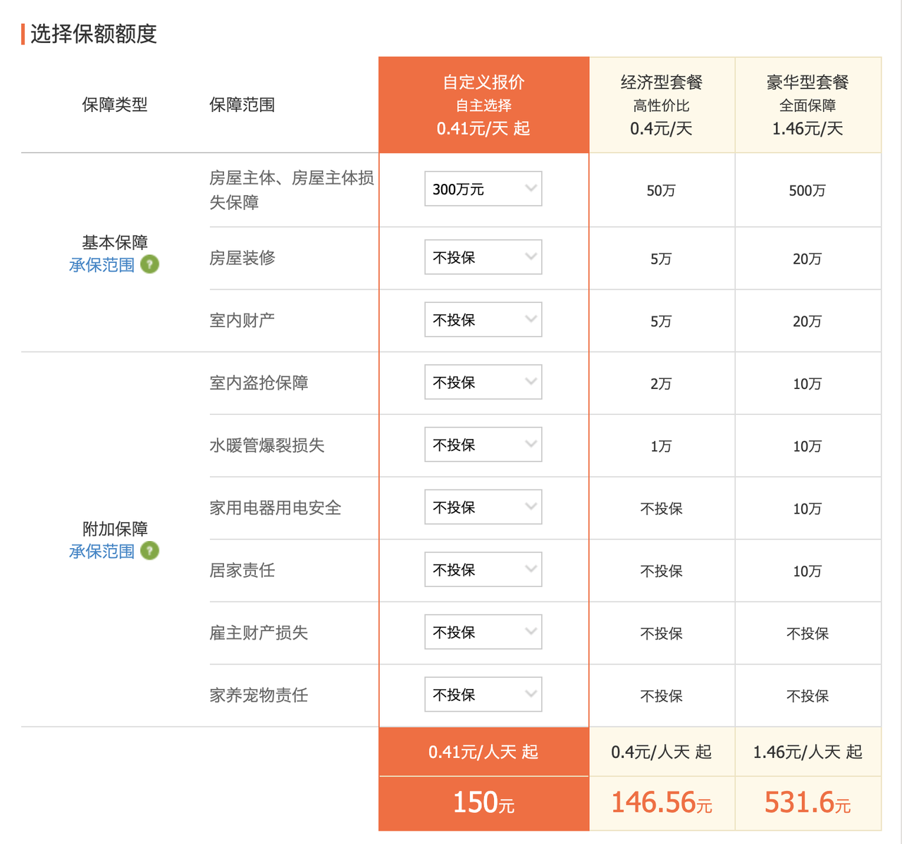 第一款是从平安官网投保的平安家庭财产保险,它可以自主选择保障责任和保额,然后生成保费。我之前选的是房屋主体损失 + 水暖管爆裂损失,因为没理赔过,续保的这两次,每次保费几乎都是在上一年的基础上打个八折,非常划算。适合想自己 DIY 保障责任的人投保。