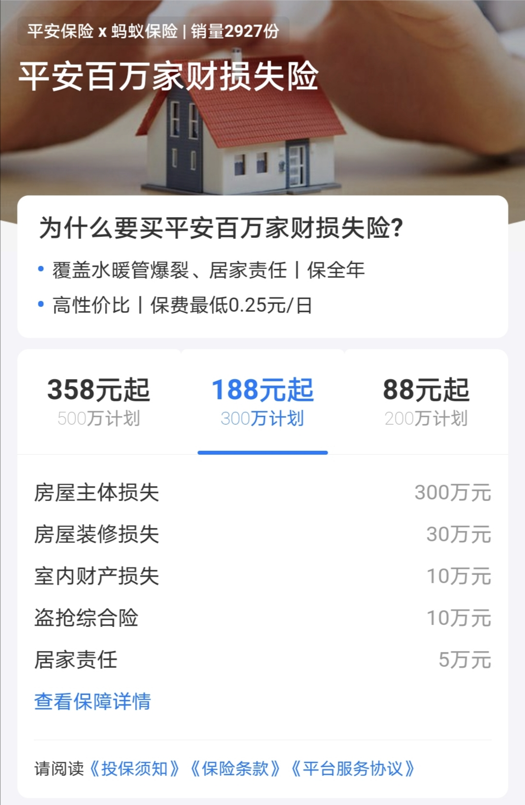 第二款是从支付宝投保的平安百万家财损失险。三个计划的保额是固定的,房屋主体损失分别是 500 万元、300 万元和 200 万元,对应的保费是 358 元、188 元和 88 元。虽然几个月之前,300 万计划对应的保费还是 168 元,但这款产品性价比还是很高的,适合自住投保。