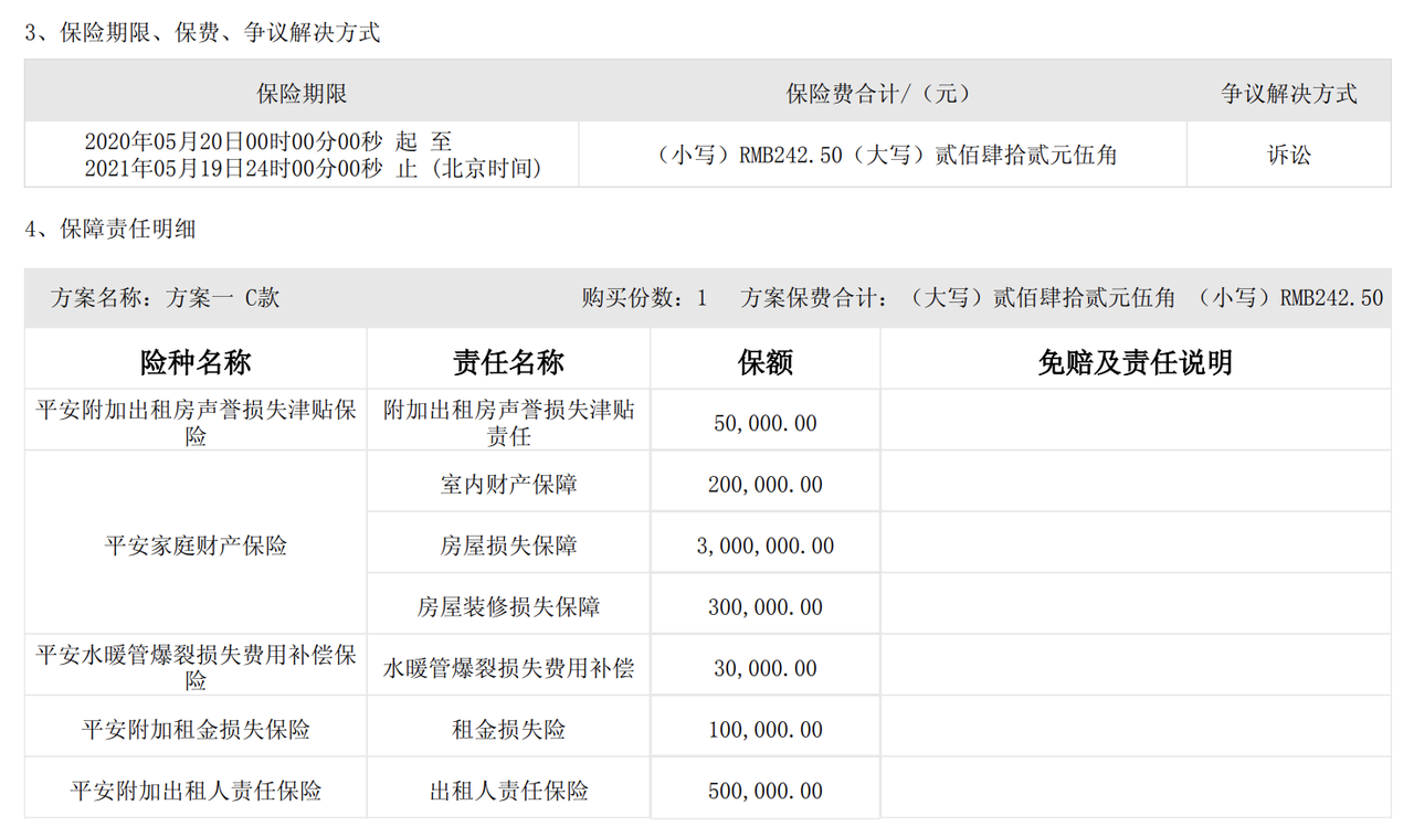 还有一款是从平安代理人那投保的平安房东家财宝,我在年度半价的时候买的,才 242.5 元/年。它的保障责任跟支付宝上的平安家财险很像,少了盗抢综合险和居家责任,多了几项跟出租有关的保障责任,比如出租房声誉损失津贴责任(如果在出租期间,屋内因自杀或者犯罪行为发生人身死亡事件,保险公司会按保额进行赔付)。比较适合出租房子的时候投保。