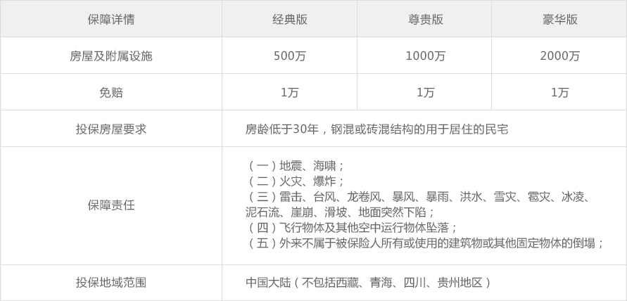 保障地震的有两类产品,一类是只保障房屋主体及附属设施的,性价比会比较高,比如天安财险的千万房屋险。它有三个计划,保额分别是 500 万元、1000 万元、2000 万元,保费只要 99 元、199 元和 366 元,每次事故有 1 万元的免赔额。