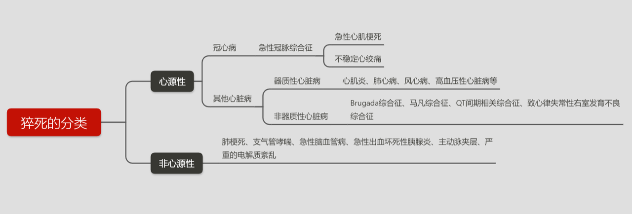 临床上猝死可分为两大类:心源性猝死和非心源性猝死。心源性猝死也称为心脏性猝死,是指由于心脏原因导致的患者突然死亡,在所有猝死患者中占绝大多数;非心源性猝死也称非心脏性猝死,是指因心脏以外原因的疾病导致的突然死亡。