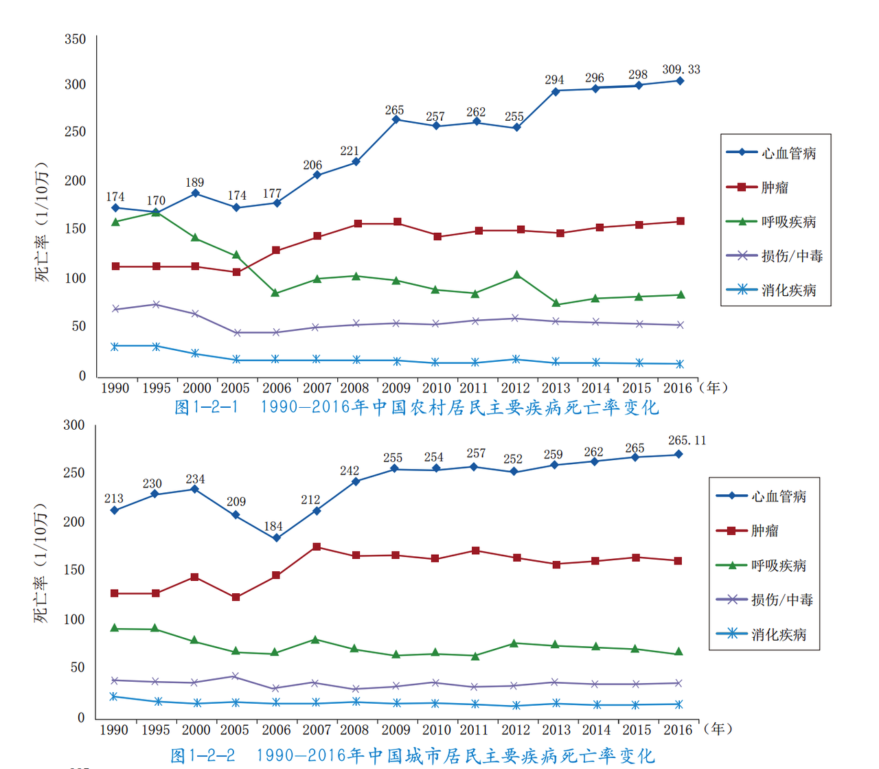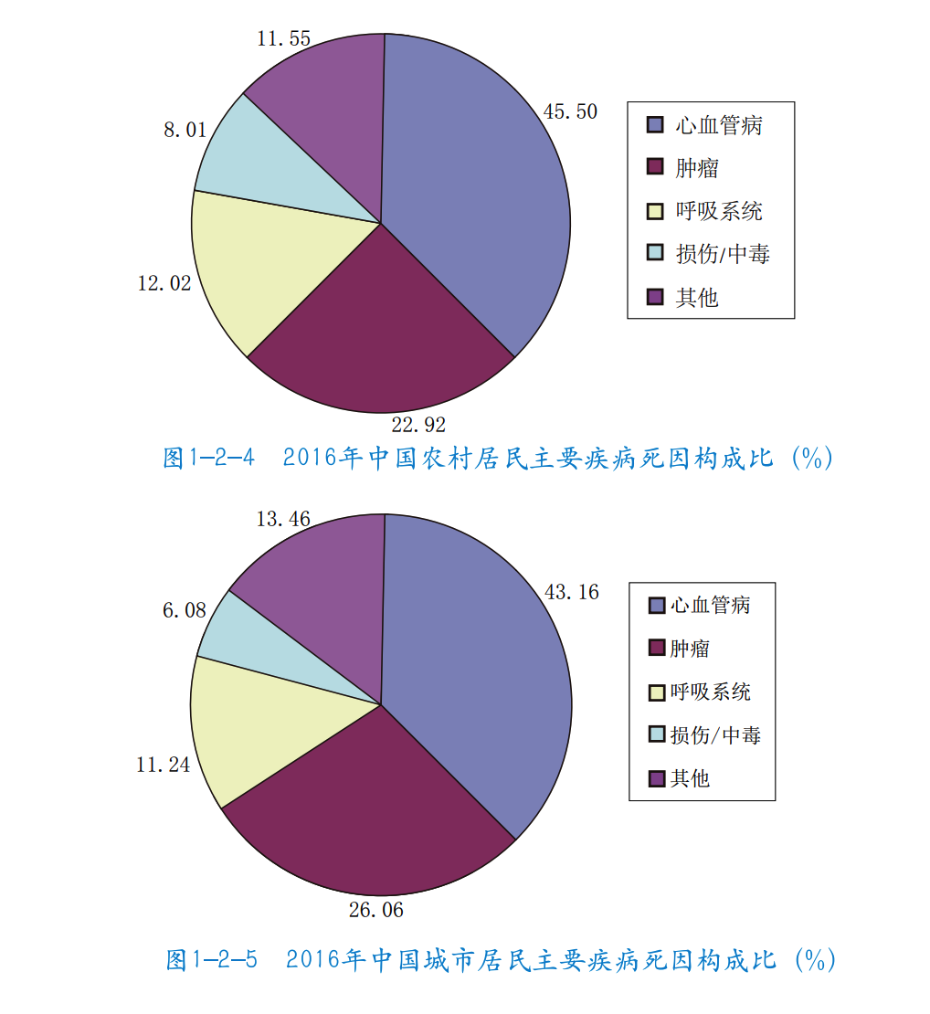 在城乡居民疾病死亡构成比中,心血管病占首位,差不多每 5 例死亡中就有 2 例死于心血管病。