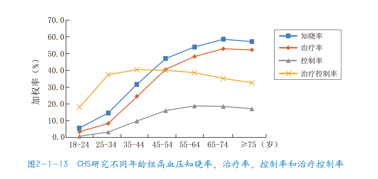 上图数据可以用「四低」来概括:知晓率低(40 岁以下高血压患者知道自己患有高血压的比例不到三分之一)、治疗率低(患者中接受合理治疗者最高也仅仅过了一半)、控制率低(大多数高血压患者的血压没有得到满意控制)、治疗控制率低(接受治疗的患者中只有不到一半的血压得到满意控制)。