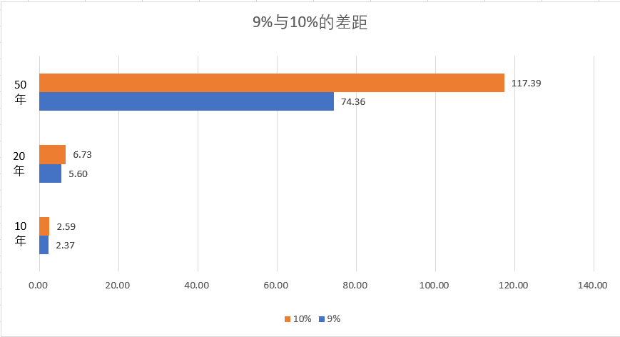 别忘了少提取费用相当于增加了基金的价值,这部分少提取的钱,长期下依旧会发挥巨大的复利积累效应。如一个是年复利收益率 10%,而另一个是年复利收益率 9%,假设初始投入 1 元,这每年 1% 的差距会有什么样的区别呢?