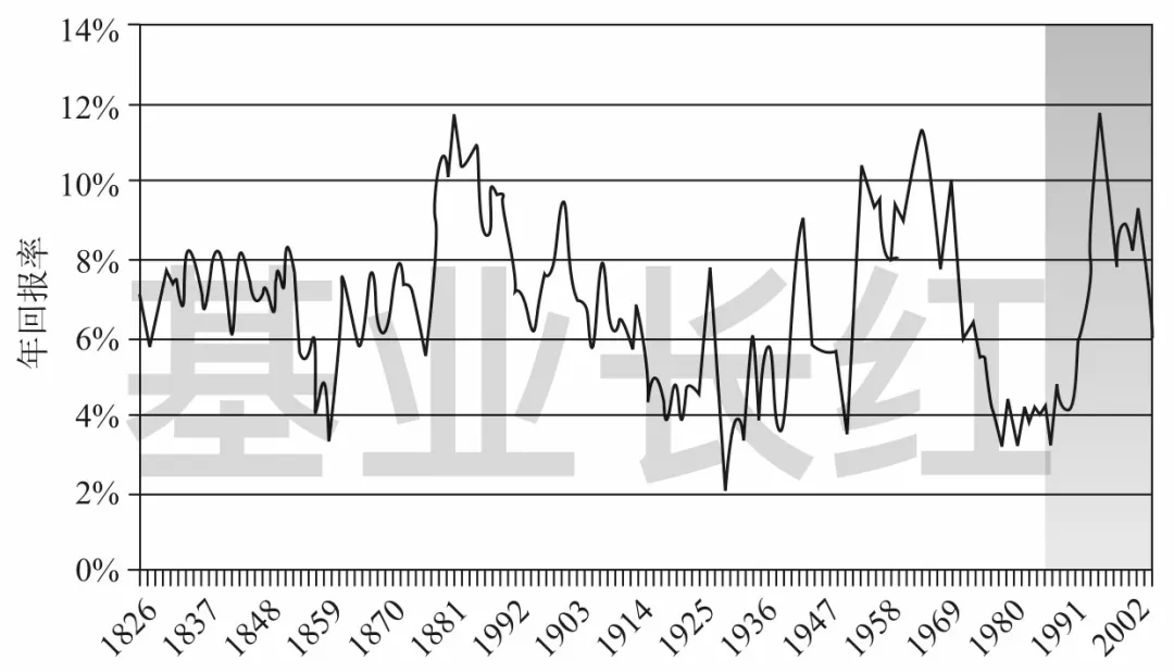 比如,1826 年的数据,是以 1802~1826 年的股市回报,按 25 年计算其年实际回报率(年化收益率扣除通货膨胀率);而 1827 年的数据,则是基于 1803~1827 年的股市回报计算……以此类推。