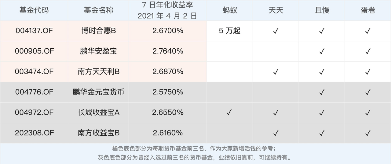 最近一周,短期市场利率依旧变化不大。截至 4 月 2 日,最新货币基金平均 7 日年化收益率为 2.3142%;银行活期理财年化收益率约 3.2%。另外,因假期数据更新不全,本期货币基金排名与上期一致,前三名依旧是博时合惠B、鹏华安盈宝、南方天天利B。